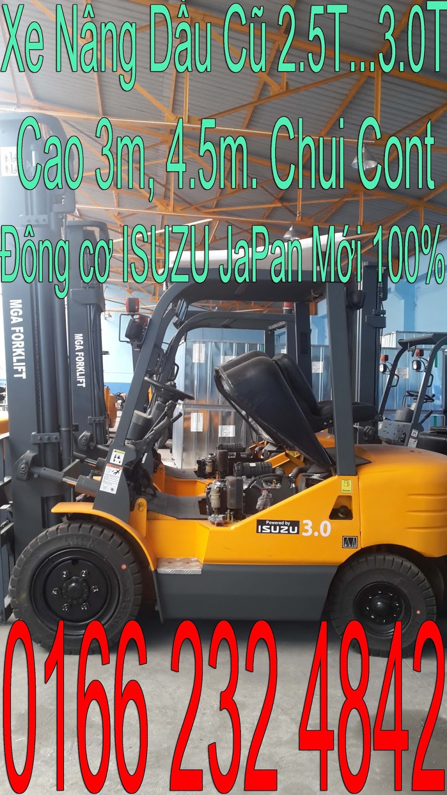 Xe nâng dầu cũ (đại tu) giá rẻ 3.500 kg / 3.5 tấn ẢNH CỦA TIN ẢNH CỦA TIN Xe nâng cũ hiện đang là mối quan tâm của rất nhiều khách hàng, doanh nghiệp. Xe nâng dầu cũ là một phương án có hiệu quả kinh tế cao, tiết kiệm nhiều chi phí ( giá xe cũ chỉ bằng 30% giá xe mới ) nhưng người mua cần có kinh nghiệm lựa chọn đảm bảo chất lượng và hiệu quả sử dụng. Công Ty TNHH MGA chuyên sản xuất và kinh doanh các loại xe nâng hạ hàng hóa mới 100% Hàng chính hãng . Và các loại xe nâng dầu đã qua sử dụng (Đại tu) Động cơ ISUZU Nhật Bản Mới 100%. HÀNG CÓ SẴN-GIAO HÀNG TRÊN TOÀN QUỐC – GIẢM GIÁ CỰC SỐC Xe nâng dầu đã qua sử dụng 3000kg/ 3.0 tấn Động cơ ISUZU Mới 100% Model: MGA-3.0T Nhiên liệu: Dầu Diesel Động cơ: 4JG2 ISUZU Nhật Bản ( Mới 100%) Chiều cao nâng cao nhất: 3000mm/ 4.500mm/ 6000mm . Chui công (3 ty 3 khúc) Chiều dài càng nâng: 1220 mm Hộp số + Thủy lực : MGA Forklift Vỏ đúc (trước + sau) : Chính hãng Sản xuất: 2013-2014 Chính hãng Bảo hành: 12 tháng hoặc 1000 giờ vận hành Xin vui lòng liên hệ để được tư vấn trực tiếp: CÔNG TY TNHH MGA VIỆT NAM Tại Bình Dương : 19/2A, KP.Hòa Long, Lái Thiêu, Thuận An, Bình Dương ĐT: 09 34 115 815, Zalo: 0166 232 4842 Email: hien@mgavietnam.com CÔNG TY TNHH MGA VIỆT NAM Tại Hà Nội : 1039-1041 Kiên Trung, Châu Quỳ, Gia Lâm, Hà Nội CÔNG TY TNHH MGA VIỆT NAM Tại Cần Thơ: 185, KP1, Ba Láng, Cái Răng ,Cần Thơ